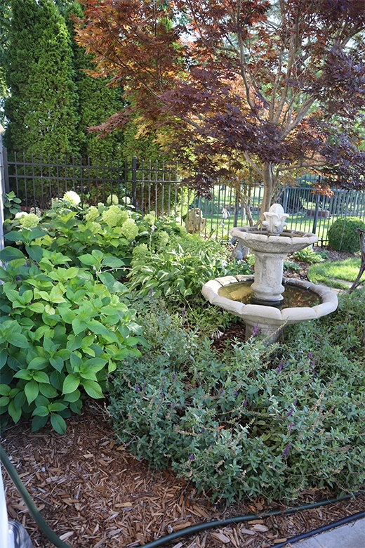 This garden space is constantly evolving as the owners work to expand the spaces each year, experimenting with new plants. Depending on the season, the property will be blooming with the homeowner’s favorite flowers, including salvia, ‘Gold Mound’ Spirea, Coreopsis, Russian sage, Dianthus, pincushion flower, and speedwell. 'Vicaryi' golden privet, boxwoods, barberry, Hosta, and creeping Jenny fill in the gaps to enhance the year-round charm of the gardens.