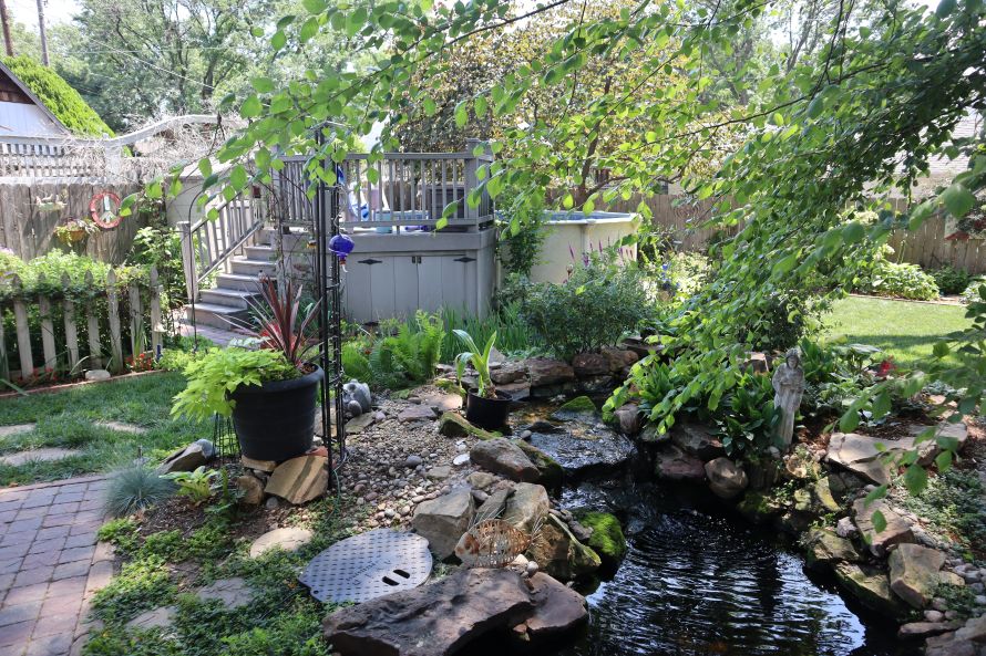 This garden is a canvas of color, where vibrant art pieces and pots brimming with cheerful annuals brighten up every corner of this property's many small gardening spaces. As you stroll the gardens, Hostas, Iris, Baptisia, coral bells, and a large silver maple tree will offer you a cozy, comfortable feeling. The sounds of splashing water features nearby will have you looking for a spot to sit and take in the loveliness of the scene.