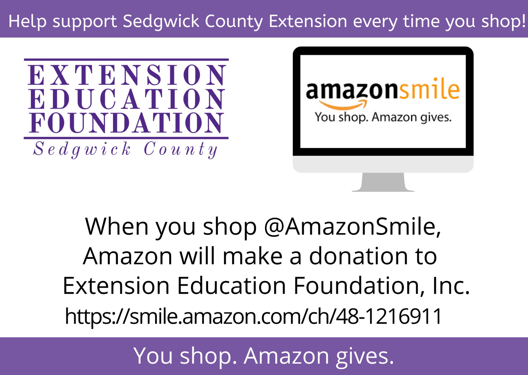 Please list our supportive nonprofit, Extension Education Foundation, Inc., as your choice of charity while shopping on AmazonSmile, and while shopping at Dillons.