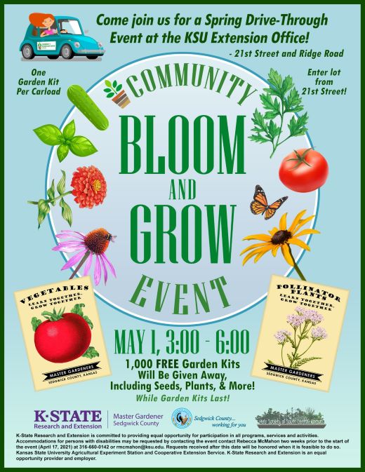 The drive-thru-only Community Bloom & Grow Event will be held on Saturday, May 1, 2021, from 3:00 – 6:00 p.m. at the Sedgwick County Extension Education Center, 21st and Ridge Road in Wichita, Kansas. Participants are encouraged to enter from the 21st Street driveway entrance, follow directional signs, and tune in to FM 99.9 for additional event information the day of the event. Kits will be given away on a first come first serve basis, and are limited to one kit per household. A total of 500 Vegetable Garden Kits and 500 Pollinator Garden Kits are being planned for this event.